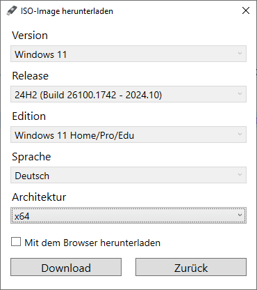 Das Runterladen der richtigen Datei macht das Tool „Rufus“, das es schon seit 2011 als Freeware gibt, siehe Wikipedia. Zur deutschsprachigen Webseite von „Rufus“ Aus dem Download-Abschnitt laden Sie die .exe für Windows x64 auf Ihren PC herunter (nicht auf den Stick). Rufus braucht nicht installiert zu werden, sondern läuft einfach durch Doppelklick. Am besten stöpseln Sie schon vorher den USB-Stick ein. Er muss mindestens 8 GB groß sein. ACHTUNG: Der Stick wird komplett gelöscht! ... denn Rufus erstellt es immer als bootfähiges Medium (obwohl wir das gar nicht brauchen werden). Wichtig: Nach dem Start von Rufus muss man der Versionsprüfung zustimmen, weil das Tool sonst offline geht und der Download von Windows.ISO-Dateien nicht angeboten wird. Falls man auf Nein geklickt hatte, muss man unten mittels des Einstellungen-Symbols die Versionsprüfung wieder einschalten und danach das Tool neu starten. |