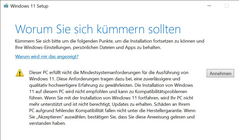 Wer eine Windows-10-Lizenz hat, darf ganz legal auf Windows 11 upgraden, so wie andere PC-Besitzer auch. Die Installationsdatei wird original vom Microsoft-Server runtergeladen. Und in Microsofts Lizenzbedingungen gibt es keinen Passus, der den Nutzer an bestimmte Systemvoraussetzungen bindet. Das Ignorieren der neuen Systemvoraussetzungen ist eine von Microsoft vorgesehene Option, die bloß aktiviert werden muss. Microsoft verhindert also die Installation ganz bewusst nicht, sondern schreibt dann extra, dass es lediglich nicht empfohlen wird. Technische Bedenken? Vielleicht! Denn das Upgrade lässt sich womöglich nicht rückgängig machen, falls es fehlschlägt. Wie hoch das Risiko ist, dass Windows 11 nicht funktioniert, obwohl es mit Windows 10 ging, kann ich nicht einschätzen. Das ist das ungewisse Risiko, dass jeder bei dieser Option selber tragen muss. Daten-Backup machen! Seine Dateien sollte man immer sichern. Insbesondere vor einem Betriebssystem-Upgrade ist die Erstellung von Sicherungskopien dringend empfohlen. Wer das nicht beherzigt, ist im Falle eines Problems wirklich selber schuld.