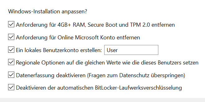 Wir stehen in keinem Handelsverhältnis zu Microsoft. Microsoft und Windows sind eingetragene Marken der Microsoft Corporation in den USA und/oder anderen Ländern. Alle Rechte am Windows-Betriebssystem liegen bei Microsoft. Wenn Sie meiner Installationsanleitung folgen, handeln Sie auf eigene Gefahr. Obwohl der beschriebene Weg auf meinem Computer funktioniert hat, kann ich (selber nur als Benutzer) nicht garantieren, dass Windows 11 und Rufus auf anderen Systemen ebenfalls funktionieren. Eine Haftung für Schäden materieller oder immaterieller Art, die durch die Nutzung der Anleitung entstehen, ist ausgeschlossen, sofern kein nachweislich vorsätzliches oder grob fahrlässiges Verschulden vorliegt. |